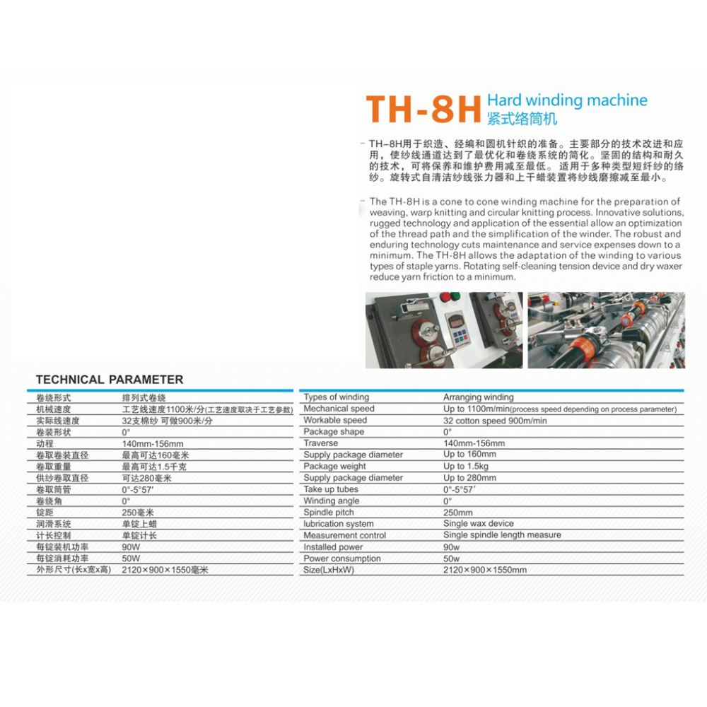 TH-8H của nhà sản xuất Taihe là dòng máy côn sợi hình nón chuyên nghiệp, được thiết kế cho quá trình chuẩn bị sợi trong sản xuất dệt thoi, dệt kim và dệt tròn. Với công nghệ tiên tiến và thiết kế mạnh mẽ, TH-8H mang lại hiệu quả vận hành vượt trội, tối ưu hóa quá trình quấn sợi và giảm thiểu chi phí bảo trì nhờ vào hệ thống điều chỉnh lực căng tự làm sạch và bôi sáp khô giúp giảm mài mòn sợi đến mức tối thiểu. Phù hợp với nhiều loại sợi .